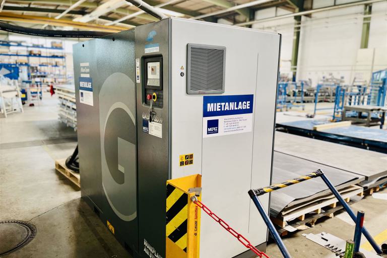 Einer unserer Kunden bekommt heute einen drehzahlgeregelten Mietkompressor GA 55 VSD mit Drehzahlregelung und integriertem Kältetrockner. In einer neuen Produktionshalle kann nun die Produktion anlaufen, bis der neue Kompressor von uns geliefert wird. In der neuen Produktionshalle ist die Heizung noch nicht betriebsbereit, aber unser Mietkompressor heizt nebenbei durch die warme Abluft die Produktionshalle.