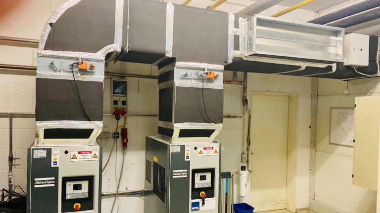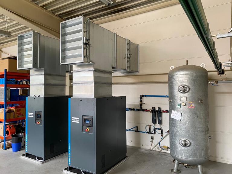 Obwohl die neuen Kompressoren Atlas Copco der Baureihe GA VSD+ bis 46°C Umgebungstemperatur zuverlässig laufen, leitet die Abluftanlage im Sommer die warme Abluft nach draußen und stellt einen zuverlässigen Betrieb auch bei hohen Sommertemperaturen sicher. Und im Winter wird die warme Abluft der Kompressoren genutzt, um die Halle zu heizen.